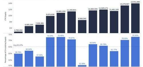 長期持有者的供應量達到流通中的比特幣供應量的72.52%.