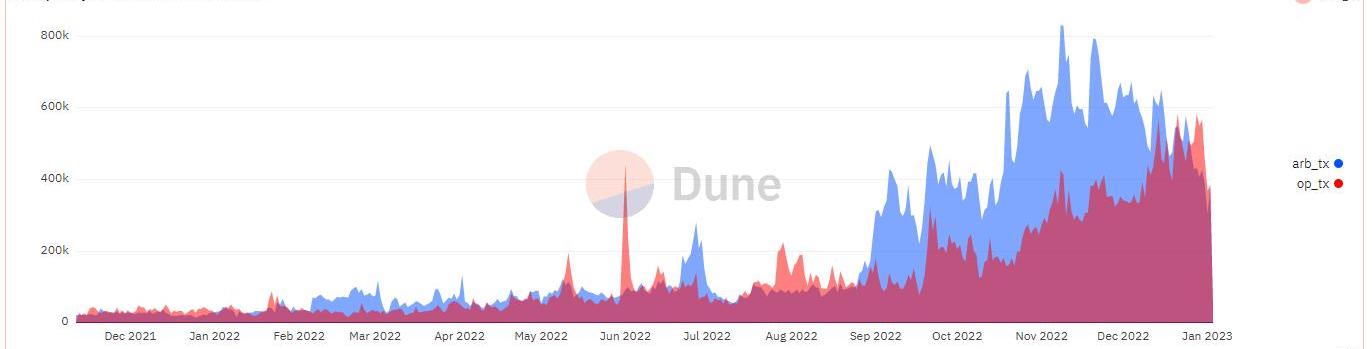 2022年是以OP和Arbitrum為代表的L2騰飛的一年,在這一年中,OP在5月推出了OP代幣,并在今年夏天配合OP生態空投掀起了一波OP小Summer。Arbitrum在6月底開啟了火熱的奧德賽活動,由于太過火爆導致Arbitrum性能不足,進行了一周就暫停了該活動。后Arbitrum在8月底完成了Nitro升級,其中性能、gasfee等方面都得到了大大的提升,也正是Nitro升級讓Arbitrum在各項數據的維度都遠勝OP。