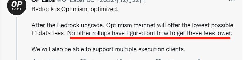 OPLabs官方推特賬戶也自信發文稱,沒有比bedrock升級后的OP費用更低的Rollup。