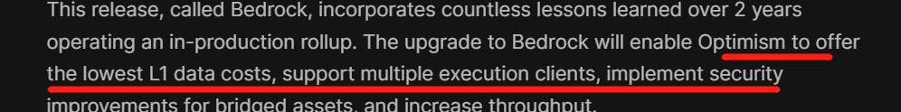 從OP年度報告中的文字也可以看出,OP對Bedrock有十足的信心,稱Bedrock升級后的OP可以提供最低的L1datacosts,提升跨鏈資產的安全性,提升吞吐量。