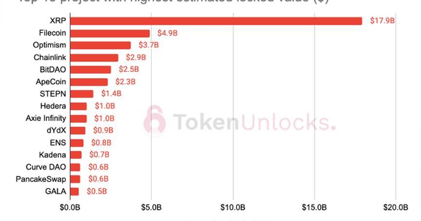接下來,我們再看下剩余鎖倉百分比,下面圖表顯示,96個加密項目鎖定了不到總供應量25%的代幣價值,其中有15個項目包含了超過75%的非流動性代幣。平均而言,一個加密項目約有38.6%的總供應量需要解鎖。最后一張圖列出了預測剩余鎖定價值最高的前15個項目,其中XRP位居榜首,代幣價值高達180億美元。
