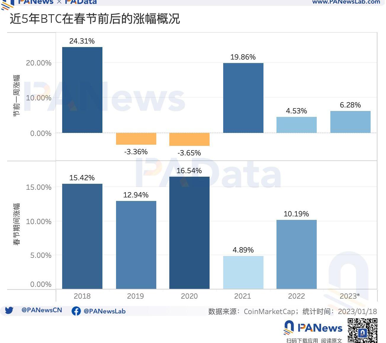 為此,PANews數據新聞欄目PAData回顧了BTC最近5年春節期間的市場數據,同時還回顧了近期熱門代幣最近3年春節期間的市場數據,統計發現: