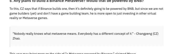 昨日,Binance官方發布的CZ最新AMA內容總結中顯示,CZ表示,如果Binance構建一個元宇宙,將由BNB提供支持。目前階段,CZ更傾向于投資其他虛擬現實或元宇宙游戲。Binance產品負責人MayurKamat也證實道,今年可能會帶來更多「由Binance提供支持的元宇宙」。