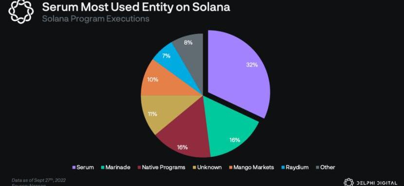 為了理解為什么會想在底層網絡上做這些改變,我們可以看看Serum和Solana。Solana是一個通用的Layer1區塊鏈,被宣傳為「鏈上納斯達克」,目標是400毫秒的區塊確認時間和極高的吞吐量。Solana的主要觀點是,訂單簿交易平臺最終將接管AMM,而Solana上的指標也支持了這個觀點。Serum是建立在Solana之上的訂單簿應用,是Solana生態被使用最多的應用,占Solana上交易的的約1/3。Serum是Solana上的「訂單簿層」,供MangoMarkets、Zeta、Atrix、Bonfida、Jupiter等項目使用。當人們想到Solana時,他們通常會想到Serum。