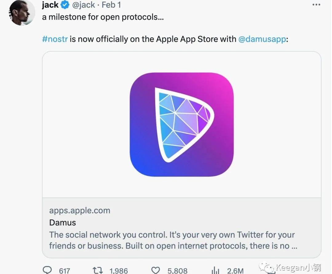接著再來聊聊?Damus,這是最近突然火爆的一款iOS應用,可直接在蘋果應用商店下載。簡單地說,Damus是一款去中心化的推特,它的出名開始于推特聯合創始人JackDorsey在推特上對它的推廣,如下圖: