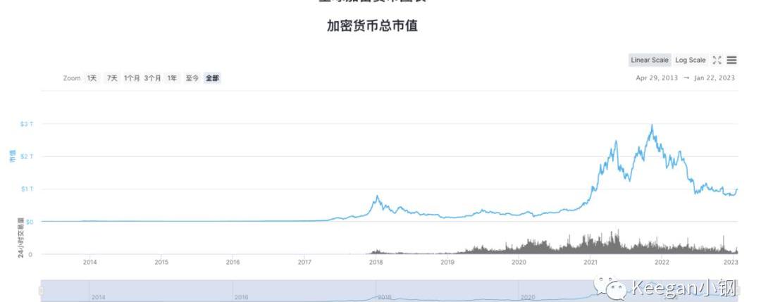 接著,再來看看整個加密貨幣總市值的趨勢圖,某種程度上,這也代表了整個Web3行業的總市值。下圖的數據來自CoinMarketCap: