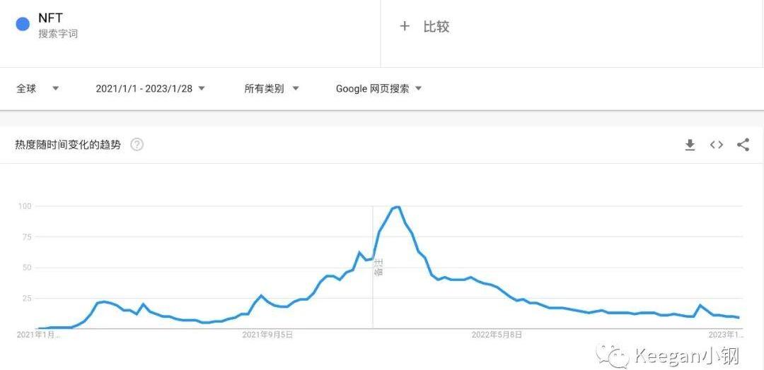 NFT從2021年開始獲得很多破圈的發展,除了加密原生的NFT之外,也延伸到了音樂、影視、體育運動、品牌等領域。但2022年的熊市也令其迅速降溫,熱度幾乎回到了2021年爆發前的低點。這從GoogleTrends統計的搜索熱度趨勢圖中也可以看出來,如下圖所示:
