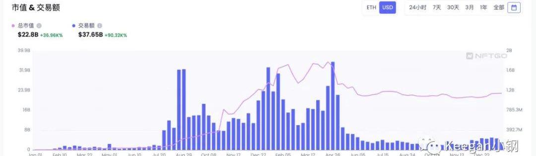 再來看看整個NFT市場從2021開始至今的總市值和交易額的數據,可以從NFTGO平臺獲取到以下數據:
