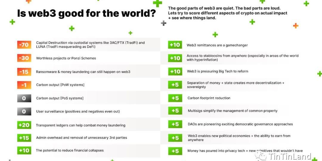 利用Web3網絡透明性,可以追溯資金流向從而打擊不法行為、追蹤資產和風險以規避金融崩潰;Web3領域技術創新迫使知名科技公司進行改革,如亞馬遜正在構建去中心化搜索引擎和社交網絡;新的治理機制DAO在發展過程中展現出許多開發潛力;......盡管從上圖的影響力數據來看,這些讓世界變得更好的事件在當下影響“甚微”。但不容忽視的是,相比于4起惡劣影響事件,Web3在多領域展現了其創新潛力。如今加密行業尚處于探索期,為了解決傳統互聯網中利益分配、平臺壟斷、個人隱私泄漏等問題,開發者利用區塊鏈、密碼學等技術創新摸索著新一代互聯網的發展范式。
