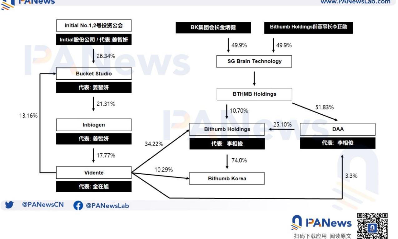 Bithumb是韓國排名第二的交易所,內部組織管理結構復雜,很多內部高管都不清楚。實際上,BithumbHoldings持股74%,是Bithumb的第一大股東。BithumbHoldings中,Vidente為控股股東,占股34.22%。Inbiogen占股Vidente的17.77%,BucketStudio占股Inbiogen的21.31%,InitialNo.1,2號投資公會占股BucketStudio的26.34%,法人代表均為姜智妍。