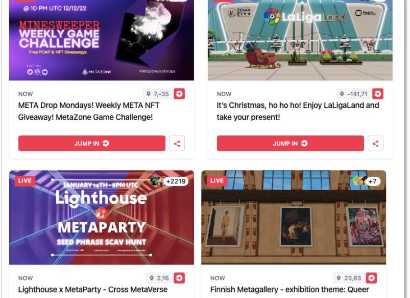 在Decentraland官網,有一個獨立記錄「事件」的頁面,上面琳瑯滿目地展示著正在進行或即將進行的活動信息。比如,1月18日,「奧卡俱樂部」將在Decentraland開啟2023尖叫派對月;歌手StoneyEye要在專屬空間演奏雷鬼音樂;1月21日,Unity咖啡廳將舉行DJ和舞蹈派對……在此之前,Decentraland中還常常有人舉辦撲克比賽、足球比賽等等。當用戶對某個活動感興趣,直接從該頁面「跳進去」,便可直達虛擬現場。