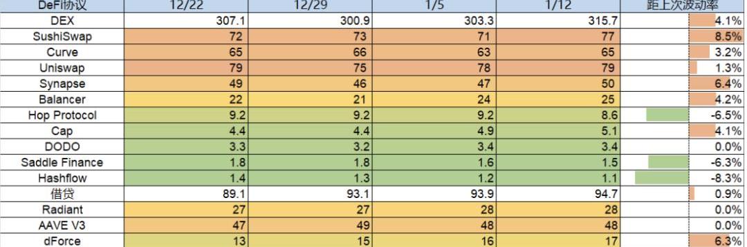 本周各鏈TVL均出現較大增長,其下多數協議也均迎來反彈,基本呈現大公鏈借貸協議增長超過DEX類協議,小公鏈DEX類增長大于借貸類,另Arbitrum本周出現滯漲,上周已完成對Polygon的反超,所有鏈中TVL第四名,本周重新回落。