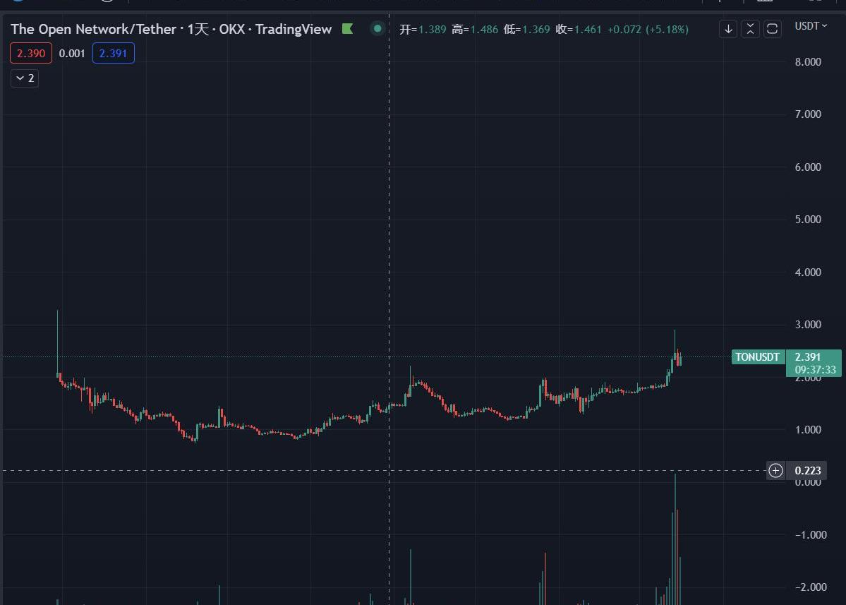 因此,Telegram代幣Ton不由得不被人關注,畢竟,這可能是幣圈第一個有著5.5億用戶基礎的項目,其代幣近期表現也值得注意: