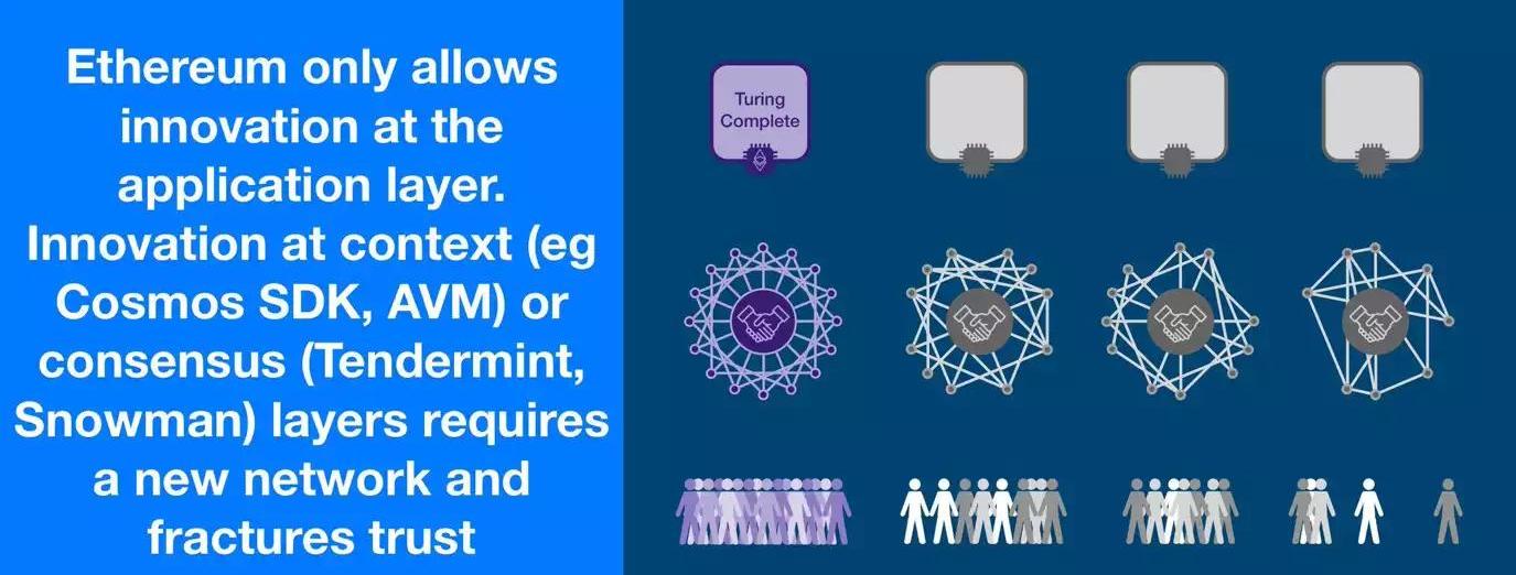 回到BTC的例子,它被概念化為用于點對點支付的特定應用鏈,因此,任何建立在網絡之上的額外Dapp都需要自己的信任網絡,這阻礙了其創新和增長。