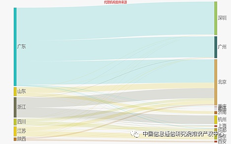 當前,中國受理局的區塊鏈發明專利絕大多數出自北京、深圳和廣州的專利代理機構,由此反映出這些地區的區塊鏈創新活躍,企業相對聚集的特點。并且,北京的代理機構還吸引了全國多省市申請人的目光,廣東、山東、浙江、四川、江蘇、陜西等全國多省市申請人一方面在本省市的省會城市尋找代理機構受理區塊鏈專利,一方面將幾乎半數區塊鏈專利委托給北京的代理機構進行受理。例如,廣東的申請人將近三分之一專利委托給深圳的代理機構,三分之一委托給廣東的代理機構,剩余三分之一委托給北京的代理機構。