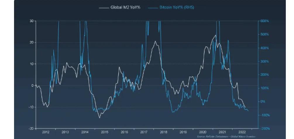 1.宏觀經濟學:利率/流動性。當M2的同比變化率反彈時,比特幣就會呈拋物線式增長——在過度杠桿的健康推動下。當M2同比增長率下降時,BTC就會被壓垮。正如我們在下圖中所看到的,當M2增加時,BTC的曲線確實從圖表中“飛越而出”。那么現在呢?全球M2同比變化率處于8年來的最低點。與此同時,BTC的價格似乎也正在觸底——我們稍后會討論這個問題。