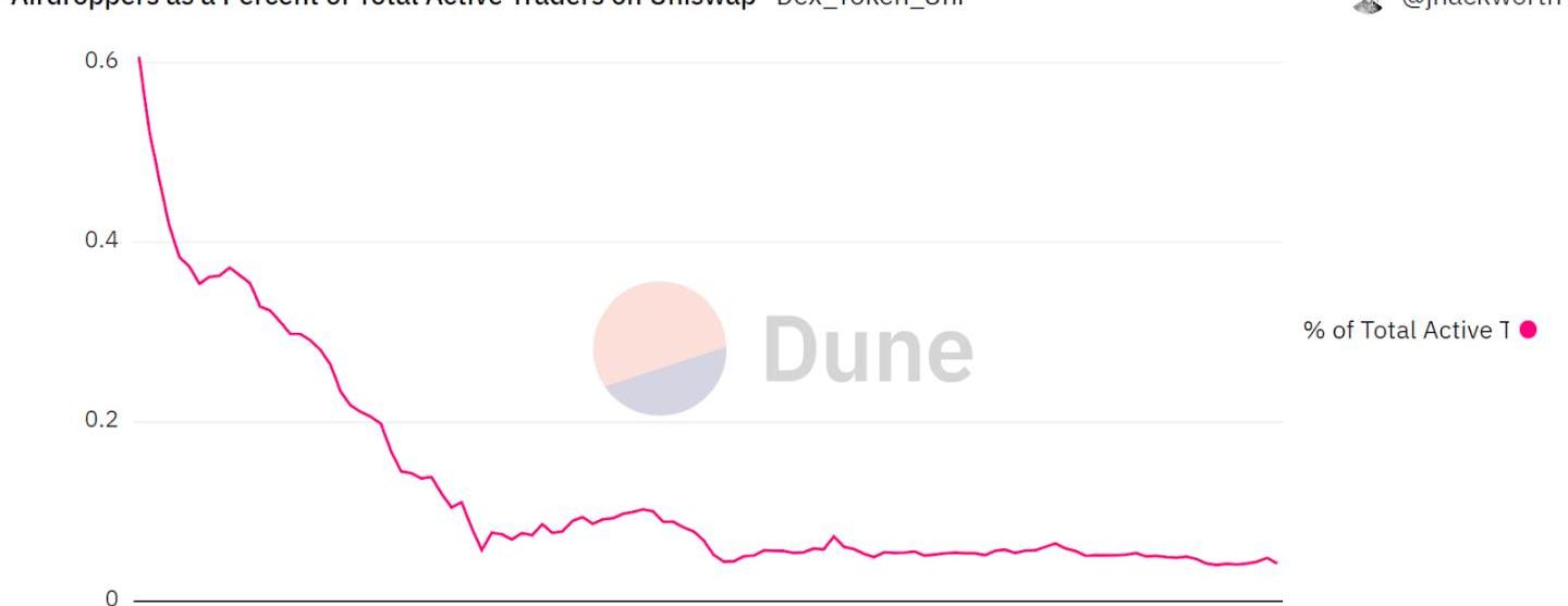所以我們知道,無論結果如何,很多用戶都放棄了空投。其余的呢,許多人仍然忠于代幣嗎?他們是否如設想的那樣,繼續成為Uniswap社區有影響力的支柱?