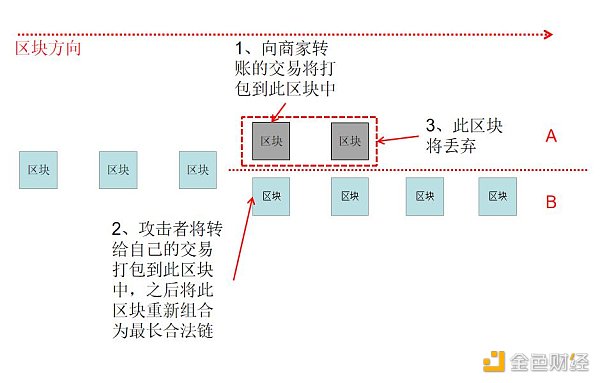 51%攻擊指的是攻擊者掌握了全網 50%以上的哈希計算 算力,擁有超過 50%的算力,攻擊者就能修改自己的交易 記錄、廢棄其余礦工開采的區塊、阻止交易確認等行為。 例如,攻擊者花費一筆虛擬貨幣購買了一件商品,同時,將虛擬貨幣發送給了自己另一個賬戶。當購買商品的 交易被確認后,會被打包到 A 鏈的區塊中,支付的虛擬貨 幣轉到商家的賬戶。此時,攻擊者發起 51%攻擊,將轉到 自己另一個賬戶的那筆交易打包進 B 鏈上的區塊,并在之 后 B 鏈組合成一條最長合法鏈,而礦工也將從 B 鏈后面繼 續挖礦,之前 A 鏈的區塊就將被丟棄,商家賬戶的虛擬貨 幣也將無法使用。