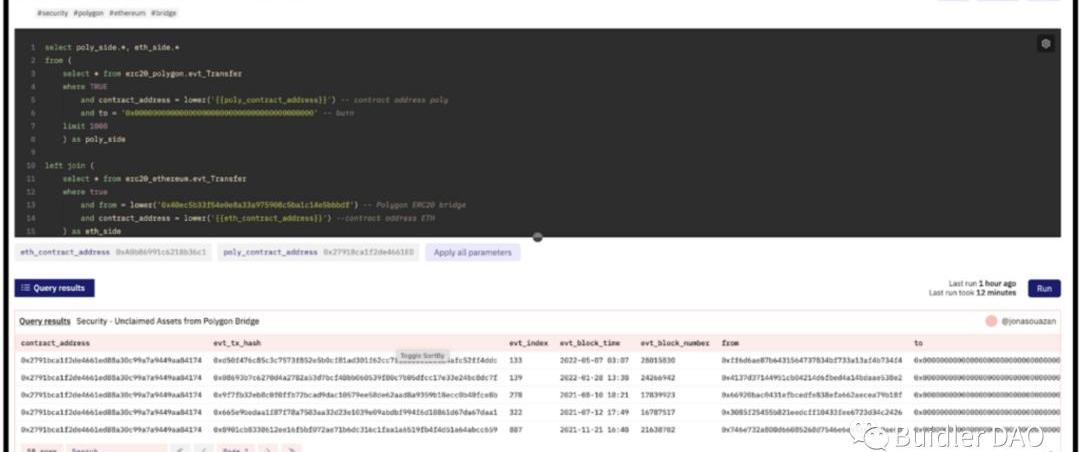 為了找到資金差異的原因,ZenGo試著將Polygon端的銷毀交易與以太坊端的對應認領交易進行匹配。為此,還利用了DuneAnalytics最近開發的允許跨鏈查詢的新查詢引擎。