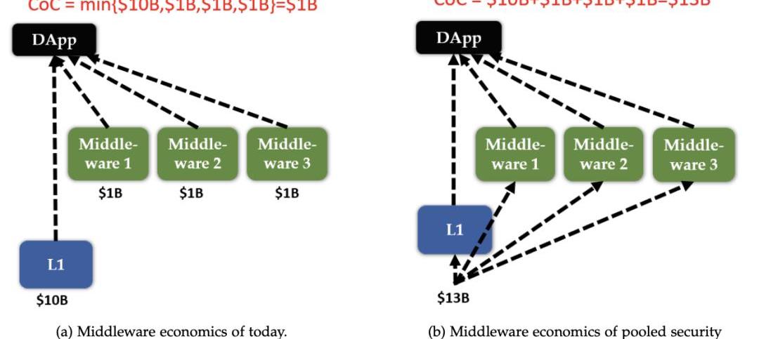 自Web3誕生以來,加密經濟安全一直是Web3面臨的根本挑戰。從比特幣的早期,到以太坊的最新升級以及其他L1網絡的迭代,建立健壯的加密經濟安全帶來了復雜的問題與權衡。區塊鏈設計當前面臨的挑戰是分散的安全性,在以太坊網絡上尤其如此。具體來說,構建在以太坊網絡之上的中間件以及非EVM應用負責生成自己的信任網絡,這在很多方面都是低效的。引導安全性是昂貴的、資源密集型的,并且需要相當長的時間來生成。此外,去中心化的安全網絡一旦啟動,就需要持續努力來維護和擴展。隨著更多應用程序的構建,加密經濟安全性在整個網絡中變得越來越分散。
