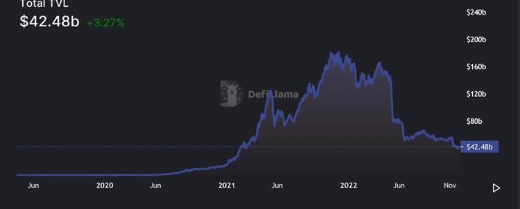 DeFi市場整體鎖倉量變動,截至2022年11月29日。來源:Defillama