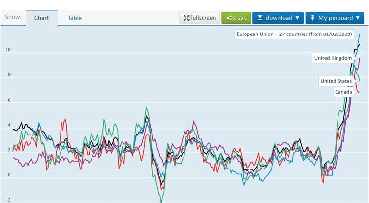 歐洲、加拿大、英國、美國通脹數據變動情況,截至2022年11月29日。來源:OECDData