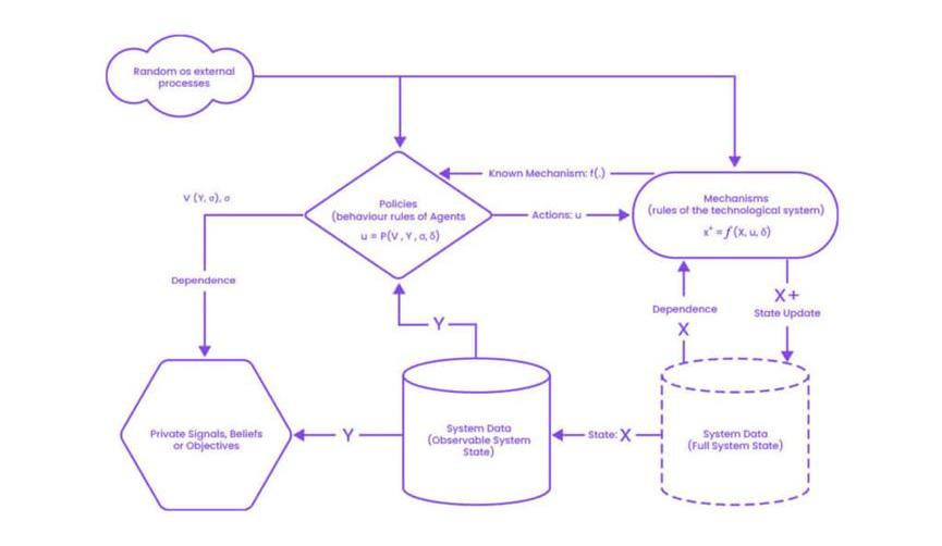 為了找到在不同市場條件下保持系統穩定性和可持續性代幣的最佳決策模型,代幣工程師會利用圖1中顯示的部分或所有學科知識來創建數據驅動模型或數字孿生。Zhang等人提出了一種基于節點的加密生態系統的建模方法。他們在技術系統中開發了節點需遵守的基本規則及其行為策略的通用模型。應用框架是借用控制工程領域的狀態空間表示。圖2顯示了該模型的高級數學描述。