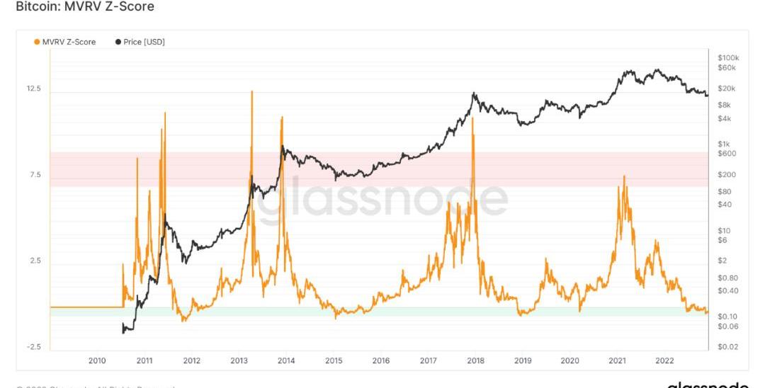長期趨勢指標MVRV-ZScore以市場總成本作為依據,反映市場總體盈利狀態。當指標大于6時,是頂部區間;當指標小于2時,是底部區間。MVRV跌破關鍵水平1,持有者總體上處于虧損狀態。當前指標為-0.22,處于綠色抄底區間。