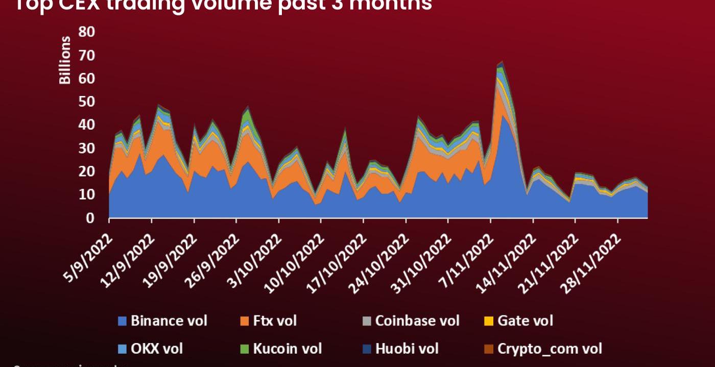 首先,讓我們看看CEX交易量在FTX破產之后是如何變化的。顯然,我們可以看到,從11月7日,FTX資不抵債后,頂級CEX交易量大幅下降。從日均300多億的交易量降至目前日均100億的交易量。誰將吞噬大部分FTX的交易量?