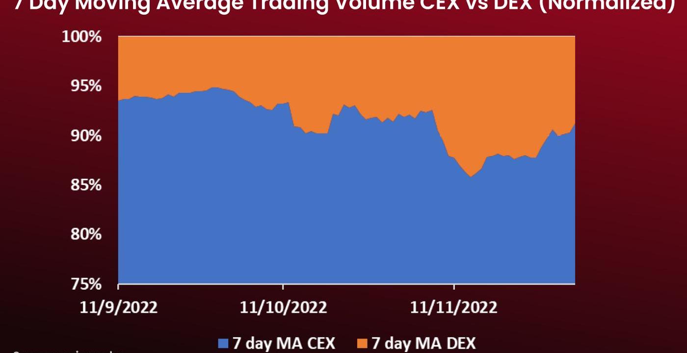 上圖顯示,過去7天,CEX和DEX移動平均交易量。我們使用移動平均線的目的是為消除交易量變化的峰值和不穩定,并使圖表平滑,以獲更好、更清晰的可視化數據。11月6日之后,日交易量維持在100億美元水平。。那么在FTX破產之后,交易者會轉向DEX進行交易嗎?