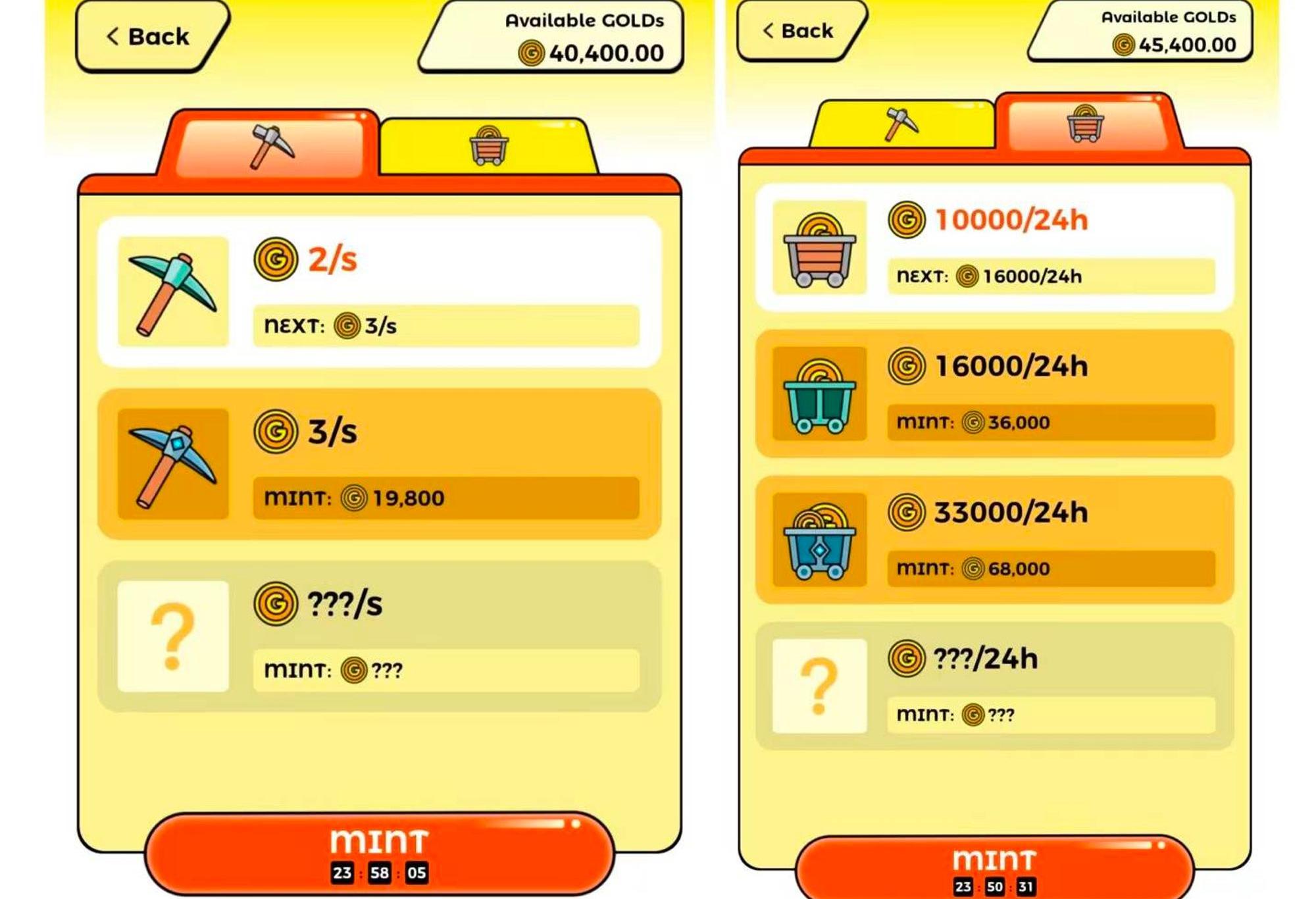 應用默認的挖礦效率為每秒挖出1枚Gold,挖礦時間為1h,單賬號上限為每24h產出10000枚Gold。用戶可通過點擊Tap按鈕來提升挖礦效率,也可以鑄造挖礦效率更高的鋤頭。2HGT/s效率的鋤頭鑄造價格為9600枚Gold,3/s效率的鋤頭鑄造價格為19800枚Gold。同時可以提升礦車容量來提升每日可挖礦數量,16000/24h礦車鑄造價格為36000枚Gold,33000/24h礦車鑄造價格為68000枚Gold。