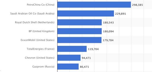 全球排名前10的能源公司的總市值約為4萬億美元。其中,沙特阿美公司以2.3萬億美元的估值領先,占前10大MC總市值的58%。