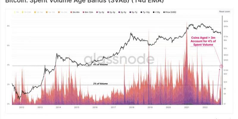 支出量時間段指標顯示,本周所有支出量的?4?%?以上來自?3?個月以上的代幣,這是?2022?年的最高水平。這與歷史上一些最大的規模相一致,經常出現在資金“投降”事件和大規模恐慌事件中。