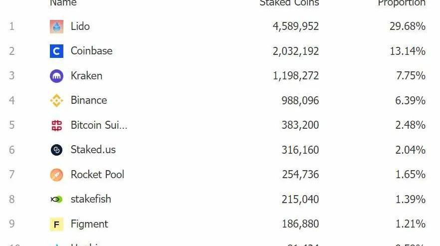 而據BTC.com數據顯示,在這160億美元的ETH中,Lido位居以太坊質押排名榜第一,共質押近460萬枚ETH,占比為29.68%,其次是Coinbase、Kraken和幣安。