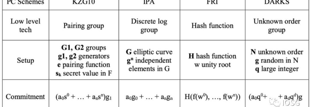當一個待證明事物經過電路處理之后,會得到一組標量和向量,之后被用來產生多項式或者其他形式的代數形式如innerproductargument(groth16)。這個多項式依然很冗長,如果直接生成證明那么無論是證明大小或是驗證時常都很大。所以我們需要將這個多項式進一步簡化。這里的優化方式叫做多項式承諾,可以理解為多項式的一種特殊的哈希值。以代數為基礎的多項式承諾有KZG,IPA,DARK,這些都是利用橢圓曲線產生承諾。