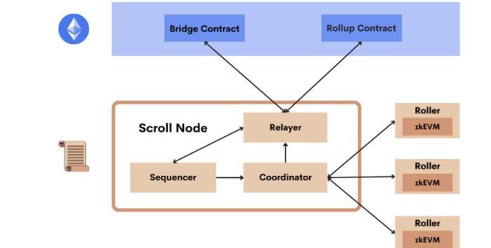 Scroll節點:從用戶交易中構建L2的區塊,提交到以太坊主網,并在L1和L2之間傳遞信息。Roller網絡:生成zkEVM的證明,確保交易被正確執行。Rollup和橋合約:為Scroll交易提供數據可用性,驗證zkEVM證明,允許用戶在以太坊網絡和Scroll之間轉移資產。這些組件的角色關系我們可以從下圖中得出: