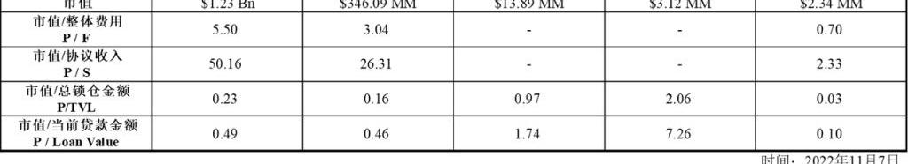 我們采用可比項目估值法對BendDAO進行估值,用P/F倍數、P/S倍數估值、P/TVL倍數估值及P/LoanValue倍數估值方法,將BendDAO與DeFi借貸領域龍頭協議Aave、Compound,以及已發幣的NFT借貸協議Drops、JPEG’d進行比較。