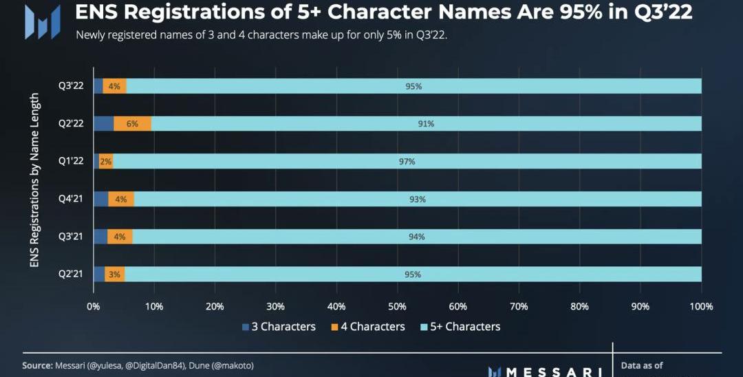 在22年第二季度,人們爭先恐后地鑄造3和4個字符名稱和短詞。隨著這些類型的ENS名稱數量的減少,創造昂貴名稱的機會也減少了。由于可以注冊這些昂貴的名稱,相對于5個以上的字符名稱,3和4個字符名稱的注冊收入份額在22年第三季度顯著下降。