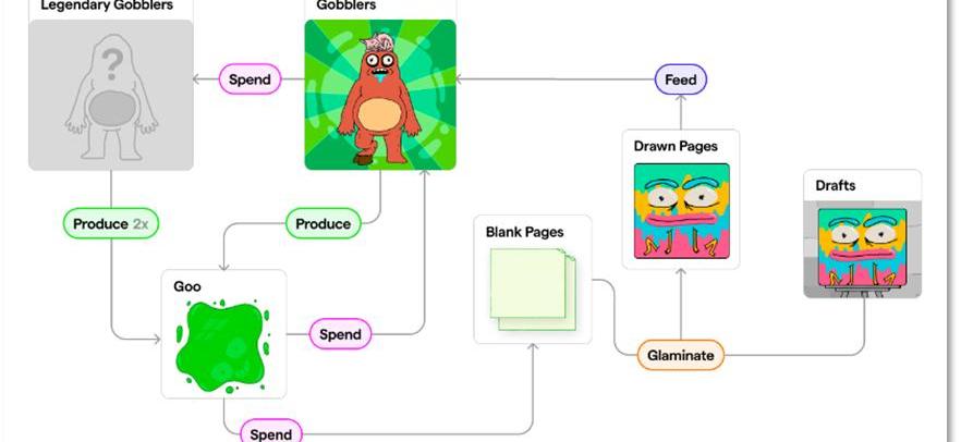 縱觀ArtGobblers的系統設計,Gobbler外星人負責「生產」Goo,Goo供創作者拿來購買BlankPage創作新的NFT作品,然后被Gobbler吞噬后展示在肚皮畫廊上,如此形成生態閉環。但想要良性運轉,就需要在GobblerNFT、GooToken和BlankPages的產出平衡上做出良好的設計,在生產力、生產工具充足時,還得讓Goo具備消耗與激勵的雙重功能從而實現良性的生產關系,哪個都不能過多或過少。