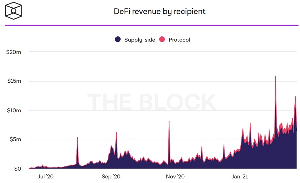 XRP/HKD+0.69%The Block對去中心化金融市場上的頭部協議收入狀況進行了分析,總體而言,許多DeFi協議都成功獲得了可觀收入。不過,雖然DeFi行業出現了流動性挖礦等一系列新舉措,但大部分收入仍然流向協議供應方(盡管這一趨勢目前已經所有改變)。另外值得注意的是,除了Balancer之外,所有DeFi協議在2021年的前兩個月都創下月度收入記錄。