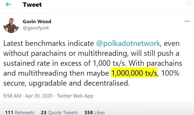 波卡(DOT)使用稱為 Grandpa / Babe 的復雜混合共識機制,該機制可使網絡處理量達到每秒約 1000 筆交易。Gavin 指出,波卡的理論上限是使用并行鏈和多線程處理每秒 100 萬筆交易。