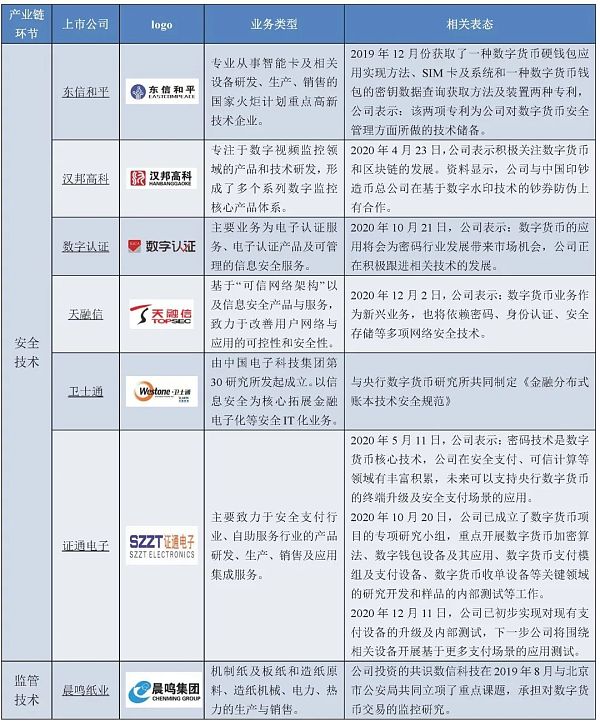 但是圖2-1所示產業圖景并不完善,根據上文的分析,在數字人民幣的研究推廣過程中還需要支付終端、安全保障等多個功能模塊的構建,這就涉及到數字人民幣背后不直接對接公眾的產業鏈條。為進一步挖掘數字人民幣產業鏈參與方,我們梳理了互動易、上證易平臺上各公司針對數字貨幣的3000余條回復,發現至少54家上市企業都公開表達了參與的意向或公布了相關研究的進展(不構成投資建議,有其他關注數字人民幣的上市企業歡迎與我們聯系)。總的來看,可大致分為監管技術、安全技術、銀行科技、錢包與支付技術、傳統設備改造和對接支付場景六類企業。