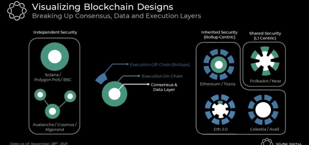 除了以太坊rollups,以太坊分片、CosmosZones、PolkadotParachains、AvalancheSubnets、Near'sChunks和AlgorandCo-Chains都是模塊化區塊鏈的探索實踐,但這些模塊化設計在如何處理跨模塊的安全方面有很大不同:像Avalanche、Cosmos和Algorand這樣的Multi-chainhubs最適合自身獨立的模塊確保安全性,而Ethereum、Polkadot、Near和Celestia這樣的模塊則采用共享或繼承的方式確保安全。