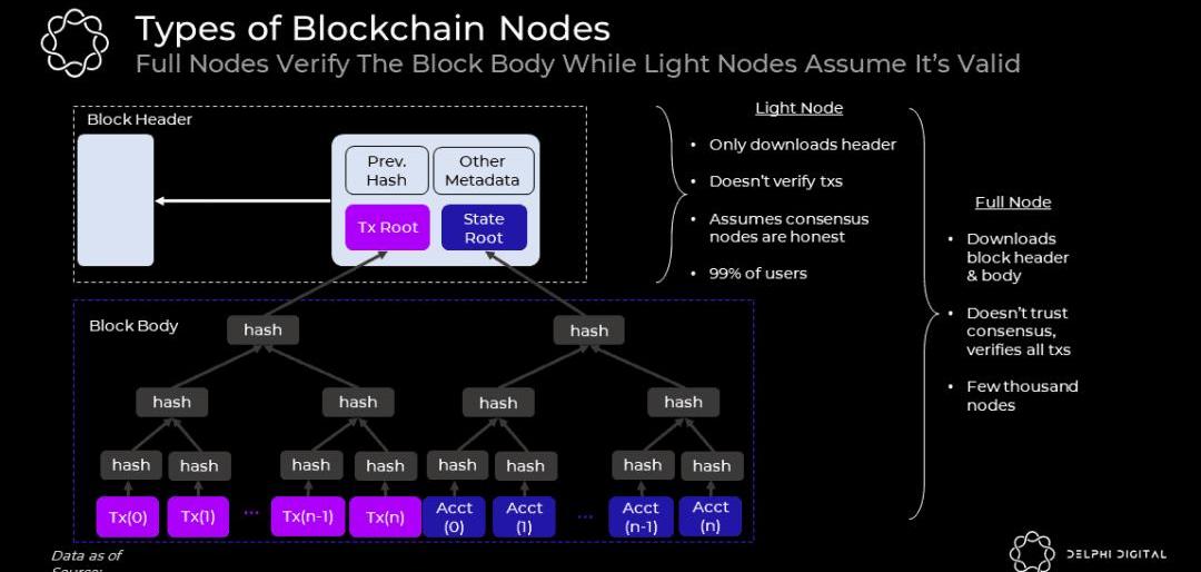 在一條區塊鏈中,共識節點生成區塊,然后向全網廣播。全節點通過下載和執行其中的所有交易來驗證交易,相比之下,由于用于搭建輕節點的設備性能一般比較差,輕節點無法驗證這些區塊的交易,而只能跟蹤區塊頭。因此,輕節點的安全保障要比全節點低得多,它們默認共識是誠實的,但顯然這不可能。