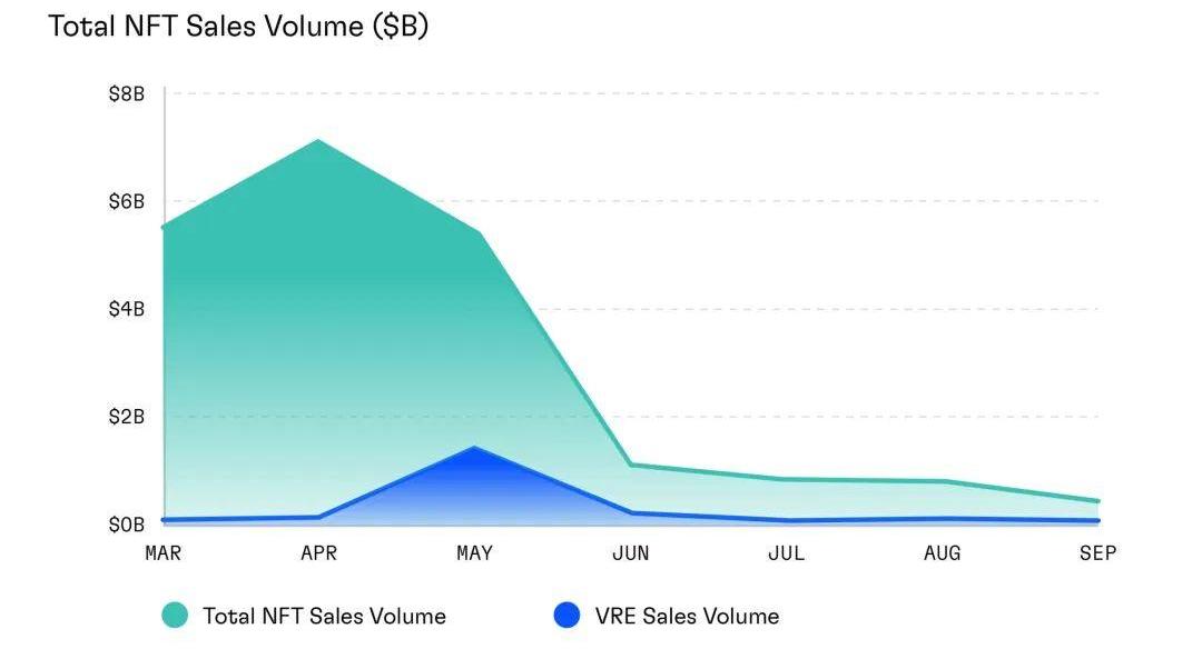 本季度NFT的整體交易量下降了84%,而且沒有像第二季度那樣出現大量的土地出讓來提振交易量。這導致了交易量的大幅下降。