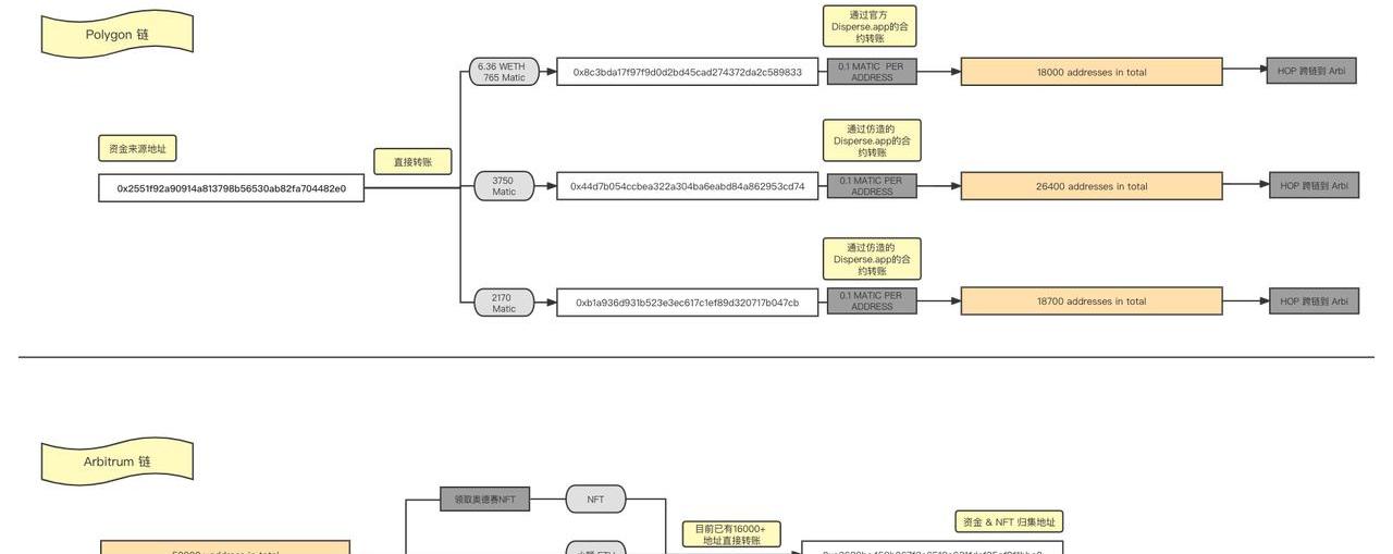 跨鏈行為相同:都通過HOP跨鏈橋從Polygon跨鏈到Arbitrum。并且都為超小額跨鏈。資金來源相同:跨鏈資金來源都間接來源于地址:0x9b8753AC5a975708a654d16F7a1C1fC9a7B98828轉賬方式相同:資金在Polygon上的分發都通過Disperse.app的合約地址。Disperse支持批量轉賬,分發地址可以在一筆交易中將資金平均分發到150個地址中。**該工具是提升羊毛黨效率的利器。**值得一提的是,該團伙既使用了官方合約,也部署了與Disperse.app功能完全一致的新合約。其背后原因可能是為了避免因為使用官方合約而被追蹤。資金&NFT去向相同:在Arbiturm上領取完NFT后,將資金以及NFT都歸集到地址0xc3638bc458b067f3e6510a631fdcf35af9f1bbe2