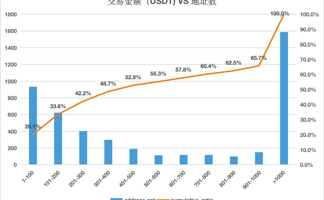 我們選取了GMX項目參與地址在ETH鏈,GMX活動開始前的數據進行分析。如下圖所示,超過6成參與GMX地址在ETH鏈上交易次數較為超過10次,并且超過四分之一的GMX地址在ETH鏈上交易超過百次。只有9%比例的地址在ETH鏈上沒有任何交易。從下圖可看出,在交易次數1到10筆的地址比重接近3成,對于我們的結論判定為參與GMX用戶大部分為活躍用戶會打一個小小的問號。隨即,我們對于這部分地址的交易金額進行了分析。