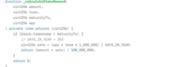 這里的stake其實比常見的挖礦計算邏輯要簡單。常見的挖礦?APY?是根據用戶質押數量占比以及參與時間來計算的,屬于隨挖隨走類型的。而這里的stake挖礦的?APY?在參與時就已經固定了,且需要在參與時就指定參與時間,在時間到期后才能領取獎勵,如果沒有到期就領取,只能取回本金,沒有任何的獎勵。