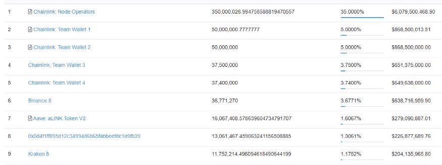 Chainlink持有量前10的地址持有近60%的代幣。資料來源:etherscan