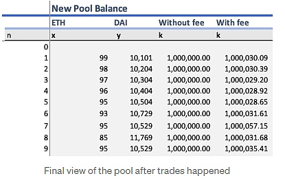 新的DAI_liquidity_pool = constant_product / new eth_pool_balance = 1,000,000 / 99 = 10,101.01。